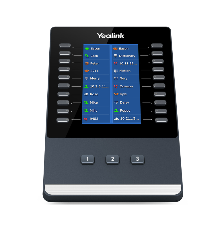 Yealink EXP43 — модуль расширения BLF-кнопок с цветным 4,3" LCD-дисплеем. Совместим в работе с IP-телефонами Yealink серии Т4U: Yealink SIP-T43U, Yealink SIP-T46U и Yealink SIP-T48U. Значения 20 программируемых кнопок отображаются на трех страницах, таким образом в память модуля расширения можно внести до 60 дополнительных значений. Доступ к любой из трех страниц одним кликом осуществляется за счет кнопок навигации в нижней части корпуса устройства. Устройство подходит для руководителей и секретарей. Модуль расширения имеет два USB-порта. Первый — для подключения к SIP-телефону (в USB-порт на задней части корпуса). Другой — для последовательного подключения другого модуля EXP43 (всего до 3 штук в цепи). В свободный USB-порт последнего модуля можно подключить USB-гарнитуру или USB-носитель для записи разговоров или сохранения скриншотов. Гарантийный срок 18 месяцев.